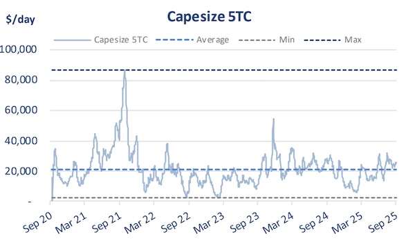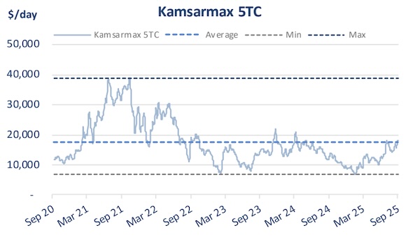 The dry bulk market entered the fourth quarter with the “wind in its sails” after a strong third quarter. In its latest weekly report, shipbroker Xclusiv said that “the dry bulk market showed notable resilience in the third quarter of 2025, supported by firm commodity flows and a steady demand outlook across key segments. Spot earnings strengthened across all vessel classes, with most segments recording their highest quarterly averages in more than a year. Capesize vessels led the market, Q3 2025 average stands at $24,223/day, the strongest quarterly performance since Q3 2024. Kamsarmaxes followed with an average of $15,888/day, their highest since Q2 2024, while Ultramaxes averaged $16,930/day, the best level since Q3 2024. Handysizes also improved, averaging $12,818/day, again marking their strongest quarterly outcome since Q3 2024”.