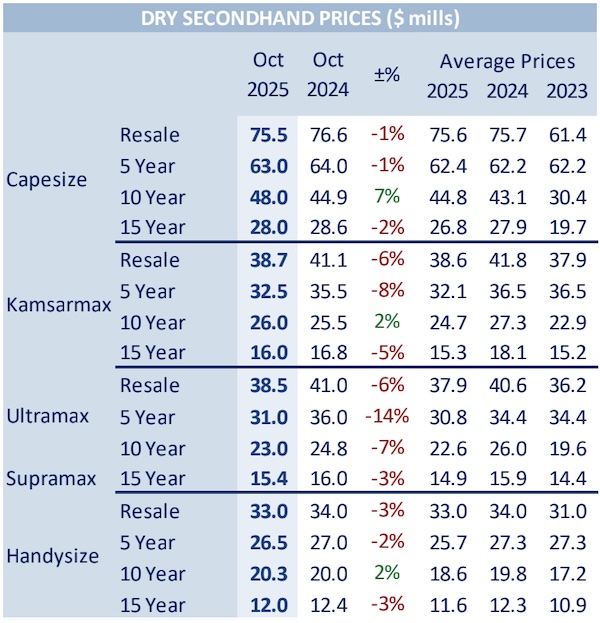 In a separate note, shipbroker Xclusiv said that “buying momentum continued in the dry sector this week, spanning from Capesize down to Handysize units. In the Capesize sector, the “Hebei No. 1” – 182K/2009 Dalian was sold for USD 25 mills. In the Panamax sector, the “Nara I” – 77K/2007 Jiangnan changed hands at USD 8.5 mills, while in the Ultramax sector Greek buyers acquired the Scrubber fitted Japanese-built “Imabari Queen” – 60K/2016 Sanoyas for USD 23.5 mills. The “Athena” – 62K/2011 Oshima was sold for USD 17.75 mills, basis TC attached at USD 14,750/day until end-2025. Chinese buyers were active in the Supramax segment, acquiring the Electronic M/E “Stonewell Pioneer” – 57K/2014 Taizhou Sanfu for USD 14.7 mills. Meanwhile, the “Aquavita Bay” – 56K/2014 JMU with electronic M/E fetched USD 20.25 mills, highlighting premiums for Tier II Japanese tonnage. The Philippines-built “Forever SW” – 58K/2010 Tsuneishi Cebu was sold for USD 15.2 mills. A major en-bloc deal saw Brave Maritime acquiring three Japanese-built Handy bulkers – the “African Heron”, “African Merlin”, and “African Goshawk” – 34K/2016 Namura for USD 17.5 mills each, marking one of the most notable Handysize moves of the week. Elsewhere, the “Dogan” – 39K/2013 SPP changed hands for USD 14.8 mills, while the older “St Theresa” – 33K/2006 Kanda fetched USD 7.2 mills. Finally, the Ice Class 1C Handy “Irma” – 35K/2000 Mitsui was sold for high USD 4 mills”.